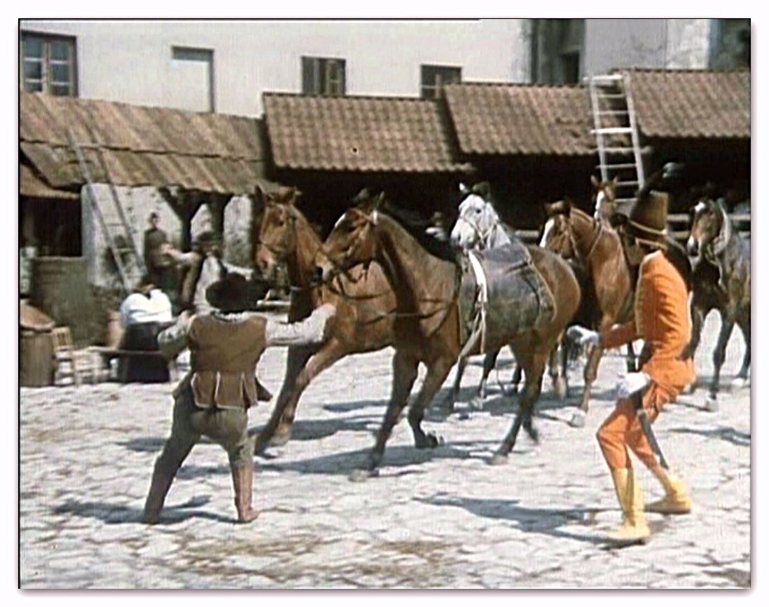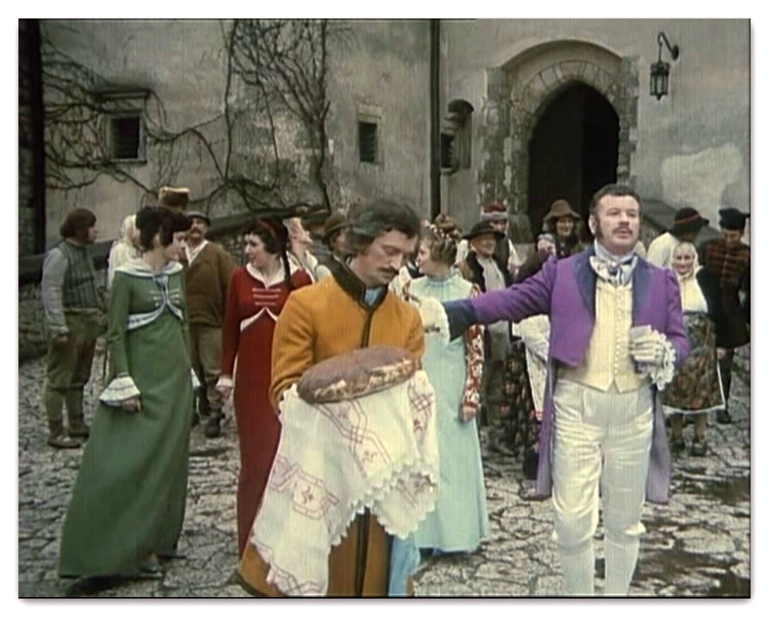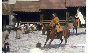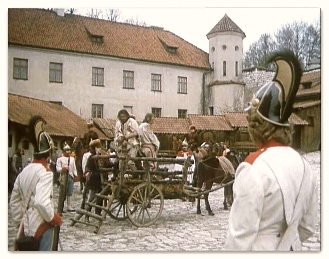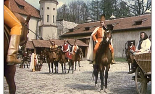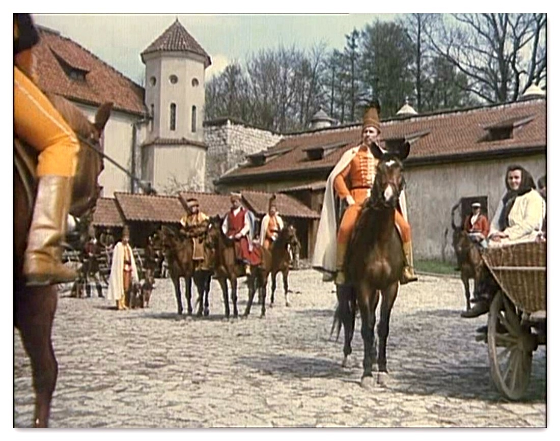 Rozległa przestrzeń zewnętrznego dziedzińca Pieskowej Skały dawała możliwość nagrania tu efektownych scen zbiorowych. Dzięki temu ta część zamku znakomicie zaprezentowała się w „Potopie”, czy „Janosiku”. Z tych samych powodów kręcono tu wymagające dystansu sceny dynamiczne, które możemy podziwiać oglądając „Stawkę większą niż życie”, „Pierścień i różę” i „Podróż za jeden uśmiech”. Nie zawsze wstrzymywano do zdjęć ruch zwiedzających i np. w filmie „Reich” możemy zobaczyć turystów przybyłych owego dnia do Pieskowej Skały.
